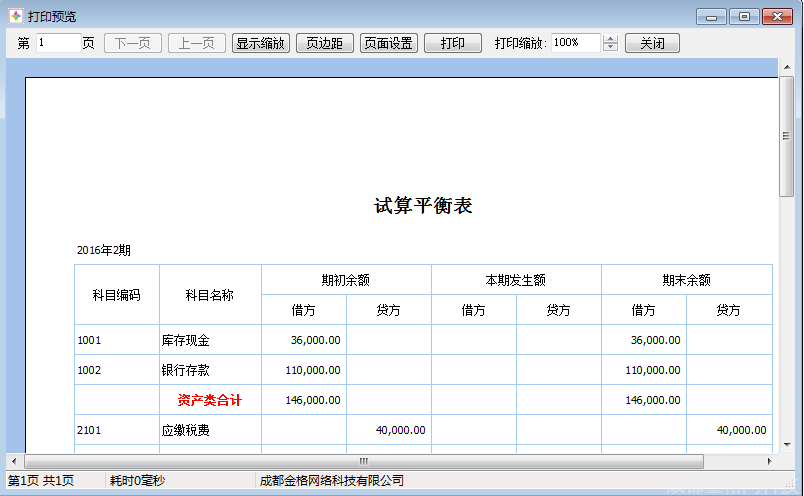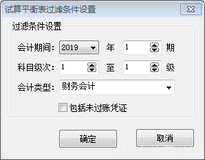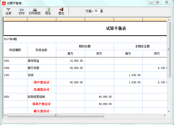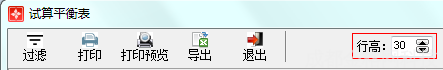 点击主界面菜单【财务管理】—【科目账簿】—【试算平衡表】或点击功能导航窗中【试算平衡表】,进入试算平衡表界面,包括过滤、打印、打印预览、导出。如图