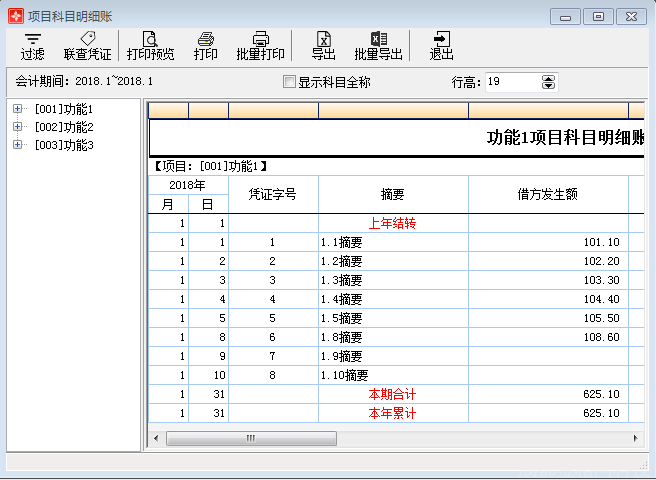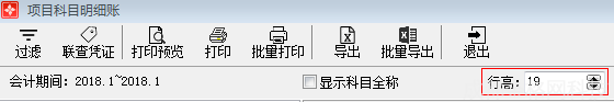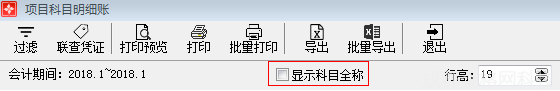 点击主界面菜单【财务管理】—【项目账簿】—【项目科目明细账】或点击功能导航窗中【项目科目明细账】,进入项目科目明细账界面,包括过滤、联查凭证、打印、打印预览、批量打印、导出、批量导出、行高、显示科目全称。如图