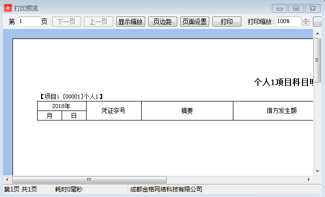 打印预览:提供调整项目科目明细账打印格式功能,方便用户查看打印效果。如图