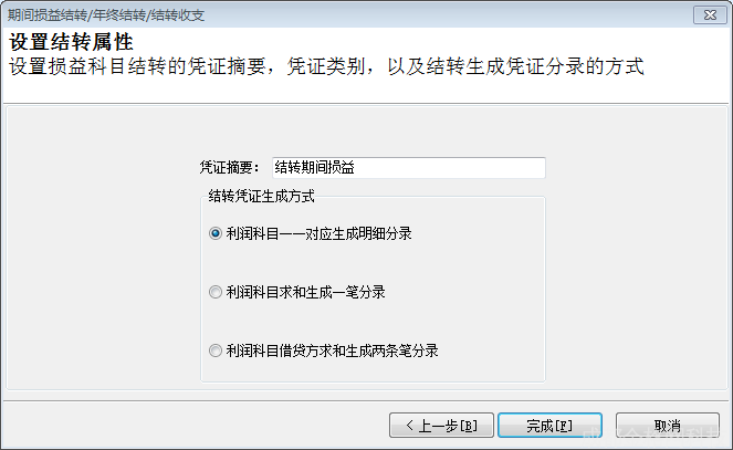 3、设置结转属性页,提供摘要、凭证生成方式定义项。如图
