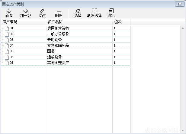 点击主界面菜单【固定资产管理】—【资产类别】或点击功能导航窗中【固定资产管理】—【资产类别】,进入固定资产类别界面,维护类别信息,包括新增、加一级、修改、删除。如图