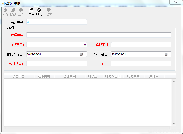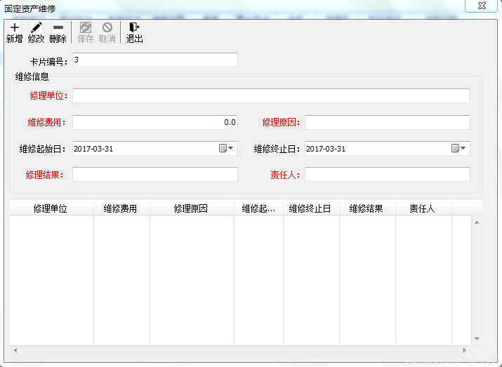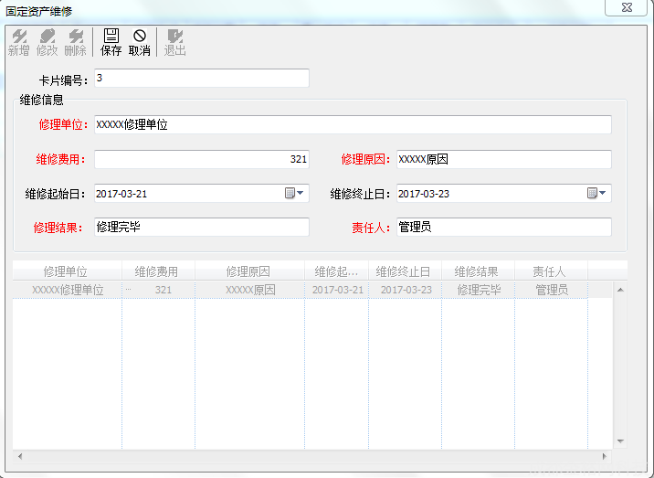 新增:点击工具栏【新增】,录入维修、保养信息。如图