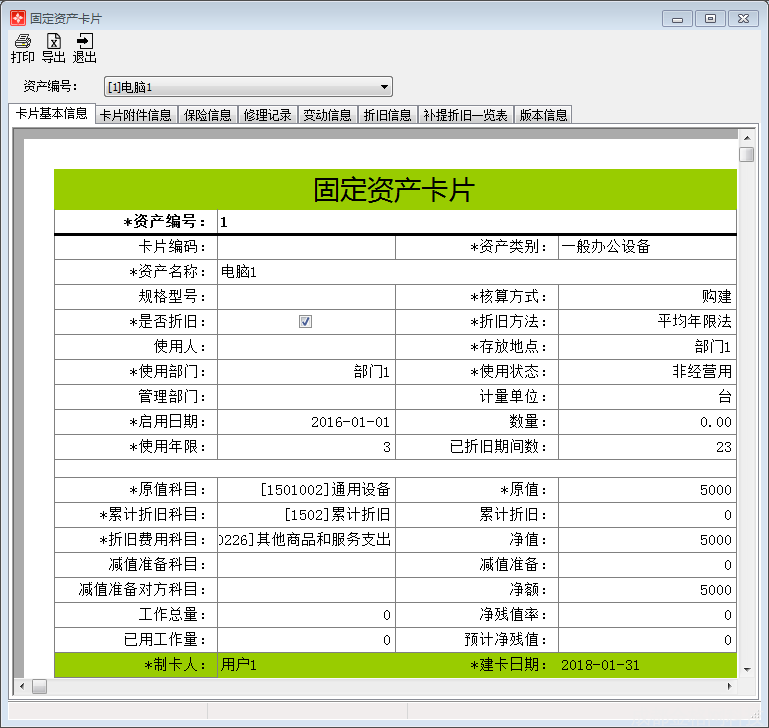 打印:提供输出固定资产卡片格式至打印机,方便用户以纸质文档形式使用、存档。如图
