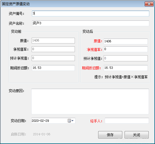 8、点击关闭,或凭证信息不能正常保存,原值变动无效;