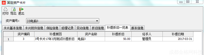 点击主界面菜单【固定资产管理】—【资产管理】或点击功能导航窗中【固定资产管理】—【资产管理】,进入卡片基础信息界面,选中资产卡片,点击补提折旧。如图