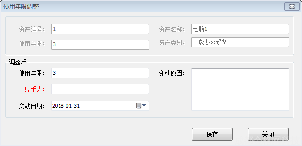 4、经手人录入更改该项固定资产使用年限或折旧费用科目经办人的姓名;
