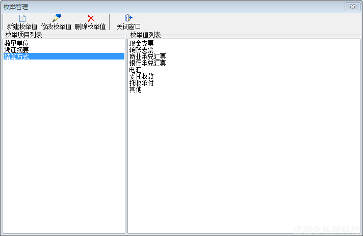 点击主界面菜单【基础数据】—【枚举项目】—【结算方式】,维护摘要信息,包括添加、修改、删除。如图