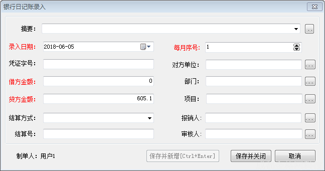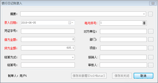 保存并新增:成功保存当前录入日记账信息,且日记账录入界面不关闭,保证用户连续录入日记账记录;