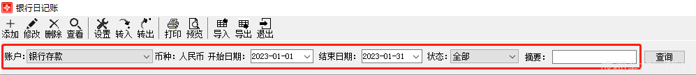 点击主界面菜单【出纳管理】—【银行日记账管理】或点击功能导航窗中【出纳管理】—【银行日记账】,管理银行账户的收、支记录,包括添加、修改、删除、排序、查看日记账、设置、转入/转出、查询、打印、导入/导出。如图