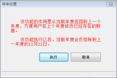 点击主界面菜单【出纳管理】—【返回上一年度】,按提示信息完成年末反结账。如图