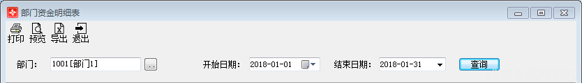 点击主界面菜单【出纳管理】—【出纳账簿】—【部门资金明细表】或点击功能导航窗中【出纳管理】—【部门资金明细表】,进入部门资金明细表界面,包括过滤、打印、导出、查询。如图