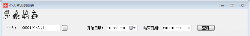 点击主界面菜单【出纳管理】—【出纳账簿】—【个人资金明细表】或点击功能导航窗中【出纳管理】—【个人资金明细表】,进入个人资金明细表界面,包括过滤、打印、导出、查询。如图