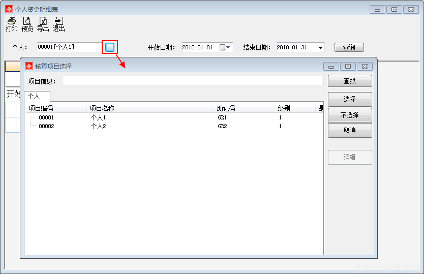 过滤:点击个人栏【...】,在核算项目选择对话框指定需要查询的个人信息。如图