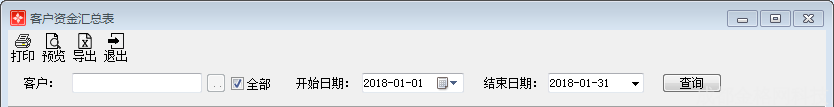 点击主界面菜单【出纳管理】—【出纳账簿】—【客户资金汇总表】或点击功能导航窗中【出纳管理】—【客户资金汇总表】,进入客户资金汇总表界面,包括过滤、打印、导出、查询。如图