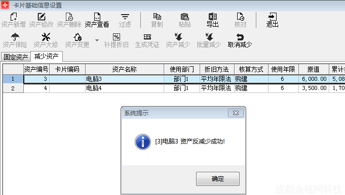 - 选中资产含当期减少凭证,取消减少操作无效,并给予‘删除当期减少资产凭证’信息。