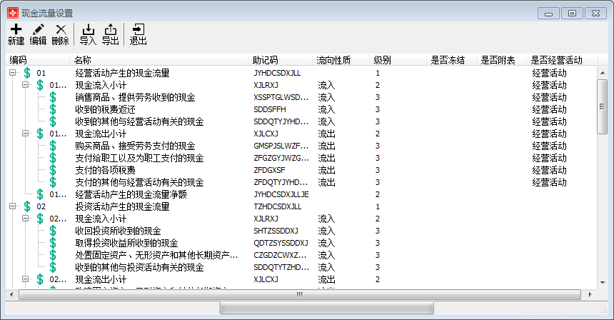 点击主界面菜单【现金流量】—【现金流量项目设置】,进入现金流量设置界面,维护现金流量项目信息,包括新建、编辑、删除、导入、导出。如图