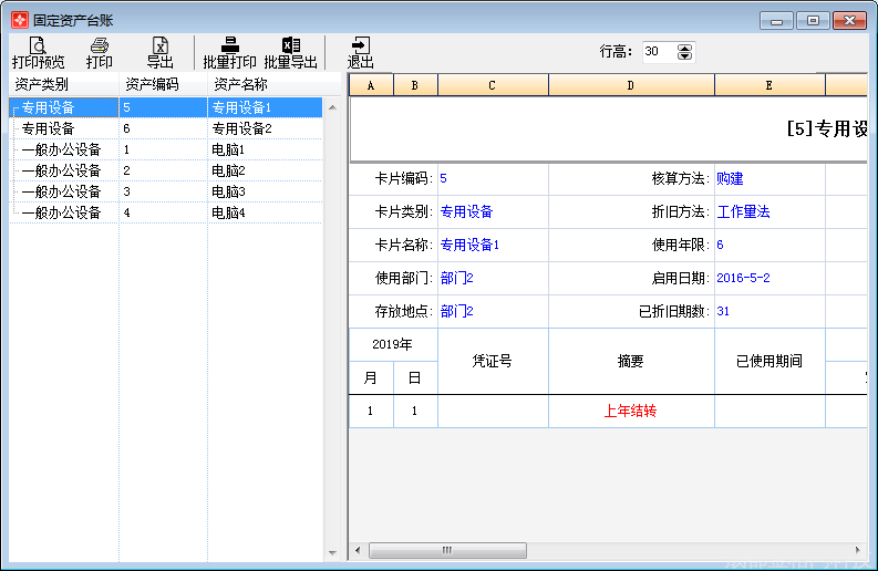 打印预览:提供调整固定资产总账打印格式的功能,方便用户查看打印效果。如图