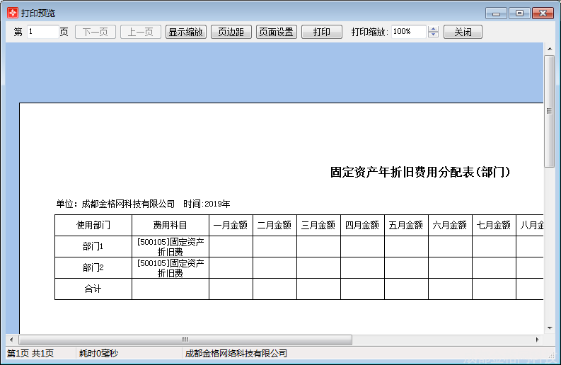 打印预览:提供调整固定资产年折旧费用分配表(部门)打印格式的功能,方便用户查看打印效果。如图
