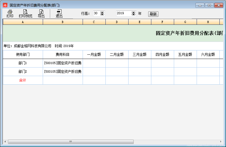 - 设置年度,点击刷新,查询指定年度内各部门所属折旧费用在各月折旧信息,不含指定期间内减少资产。