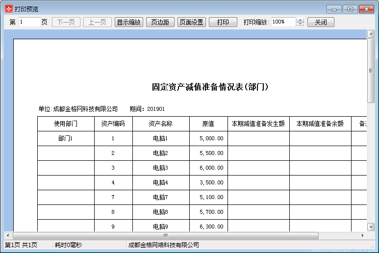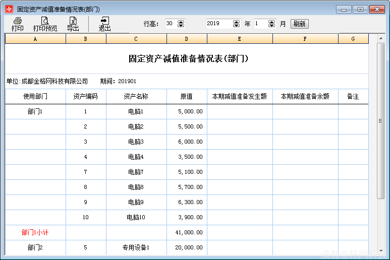 打印预览:提供调整固定资产减值准备情况表(部门)打印格式的功能,方便用户查看打印效果。如图