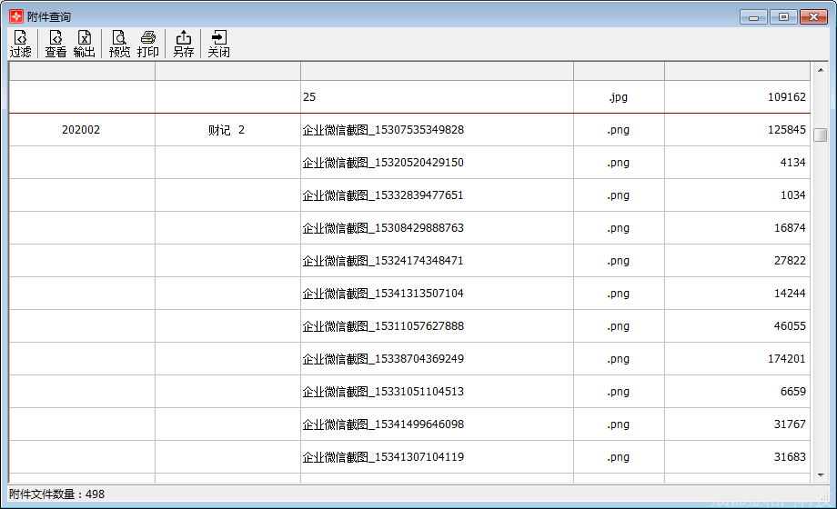 点击主界面菜单【财务管理】—【凭证附件查询】,进入附件查询界面,包括过滤、查看、输出、预览、打印、另存。如图