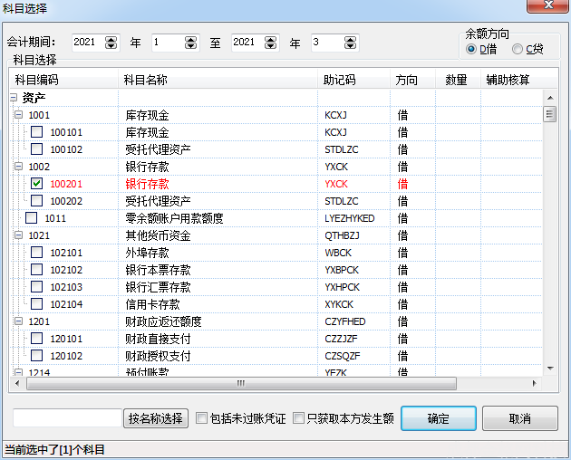 按名称选择:在单元格录入已有科目的完整名称,由软件精确查找并自动勾选。