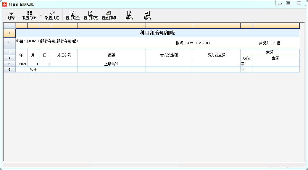 点击主界面菜单【财务管理】—【科目账簿】—【科目组合明细账】或点击主界面右侧【科目组合明细账】,在科目组合明细账界面,提供过滤、联查总账、联查明细账、联查凭证、普打设置、普打预览、普通打印、导出。如图