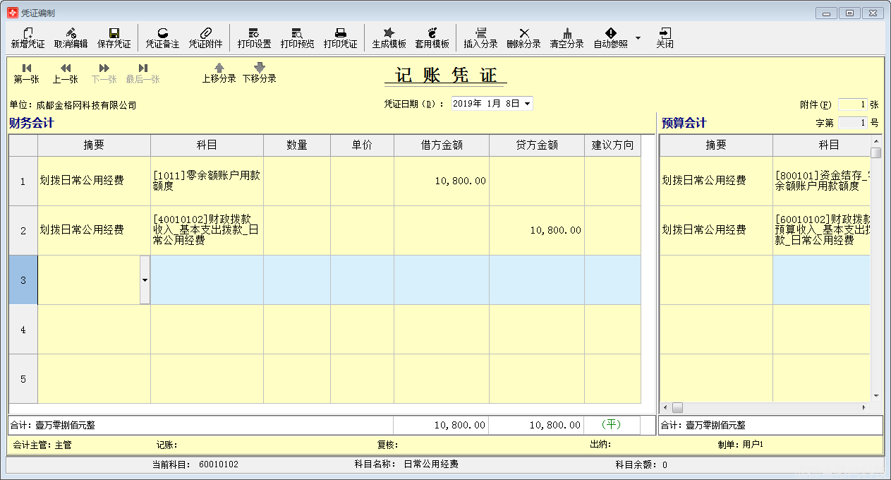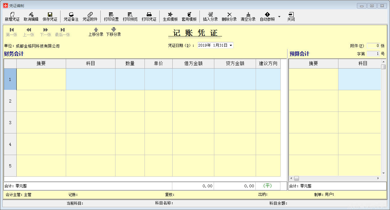 点击主界面菜单【财务管理】—【凭证处理】—【凭证编制】或点击功能导航窗中【凭证编制】,在平行凭证编制界面录入相关财务凭证及预算凭证信息,包括新增、取消编辑、保存、备注、附件、打印、生成/套用模板、插入分录、删除分录、清空分录等。如图