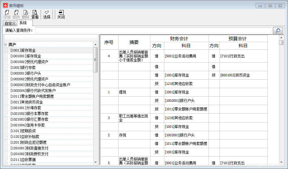 - 光标定位分录行含科目信息,按F5快捷键,调用套用模板界面,并列示系统级中含此科目的所有模板。