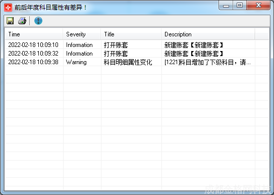 当重新结入已有科目信息的年度,为保证科目数据的正确性,将对相邻年度同一编码的科目属性进行一致性检查,有不一致的情况时给予提示信息。如图: