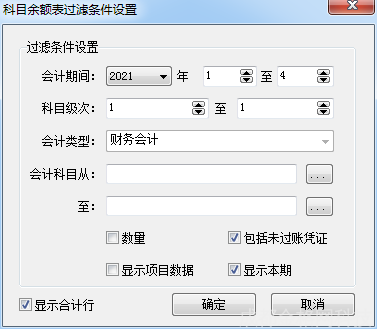 过滤:设置[会计期间]、[科目级次]、[会计类型]、[会计科目]起止范围,提供数量、包括未过账凭证、显示项目数据、显示本期查询条件。如图- 数量:勾选此项,科目余额表仅列示符合过滤条件的数量核算科目对应的数量单位、数量值、金额。