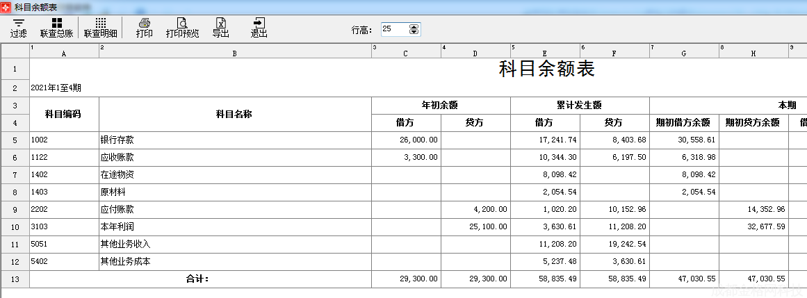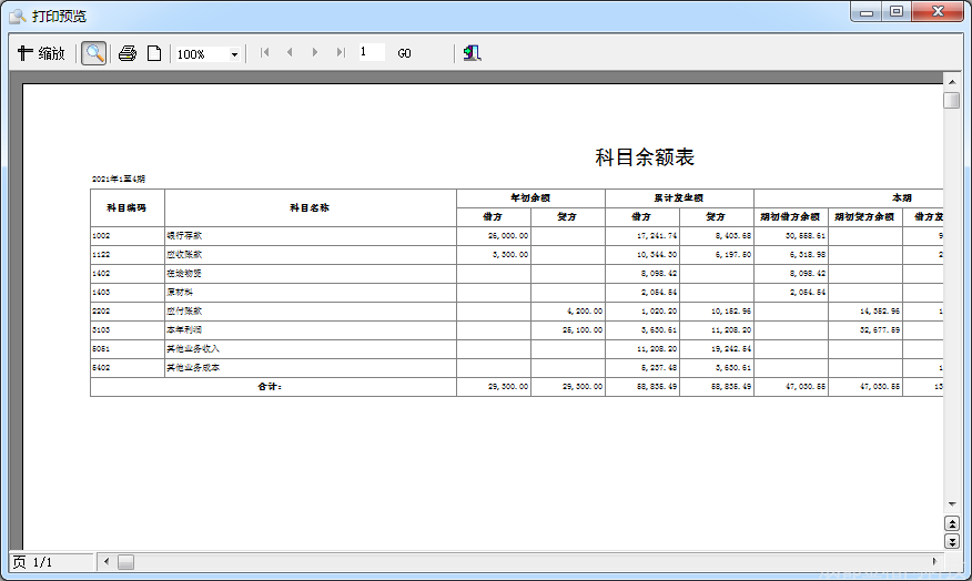 打印:提供输出科目余额表格式至打印机,方便用户以纸质文档形式使用、存档。如图