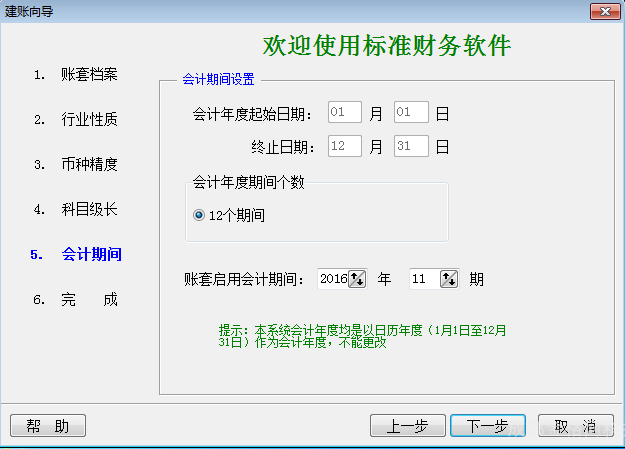 四、点击【上一步】,返回【科目级长】,且设置的会计期间保存。