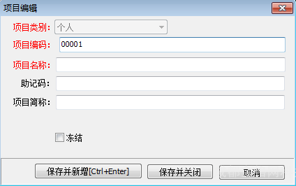 - 保存并新增:保持项目编辑窗口不关闭,同时保存录入信息,且除项目编码栏外,其余信息栏清空;满足连续录入。