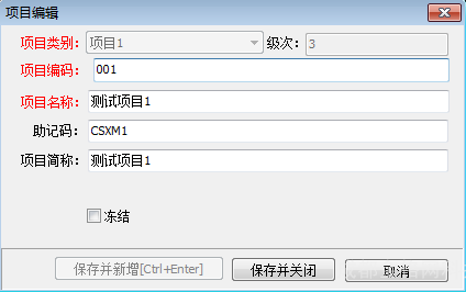 - 保存并新增:保持项目编辑窗口不关闭,同时保存录入信息,且除项目编码栏外,其余信息栏清空;满足连续录入。