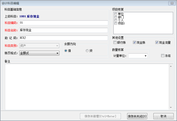 - 保存并关闭:保存录入信息的同时,关闭科目编辑窗口。