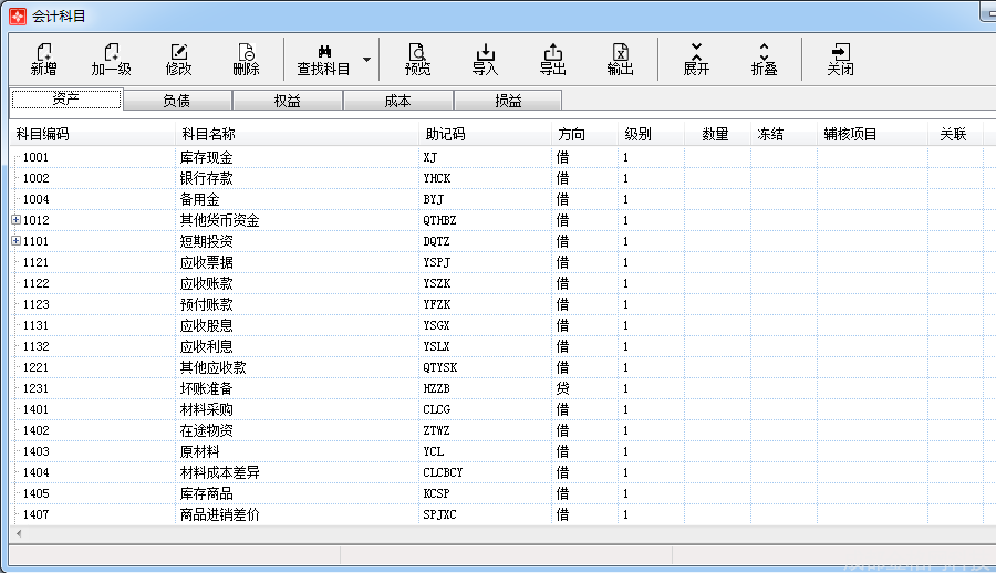 点击主界面菜单【基础数据】—【会计科目】或点击功能导航窗中【会计科目】,进入会计科目界面,维护会计科目信息,包括新增、修改、删除、查找、科目关联、导入/导出、输出、冻结、展开/折叠。如图