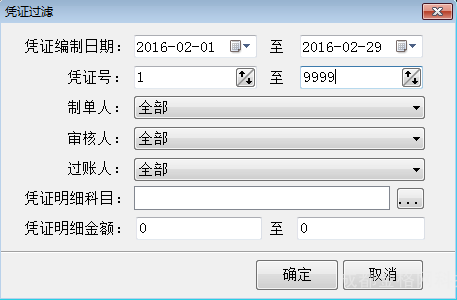 - 凭证号:默认范围1至9999,即期间所有凭证;允许手工录入或点击【▲】、【▼】按钮设置;仅允许录入数值。