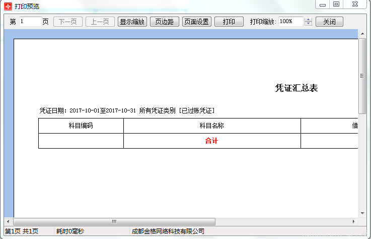 - 确定:汇总条件设置成功,并进入凭证汇总表;系统自动计算凭证的汇总数据。