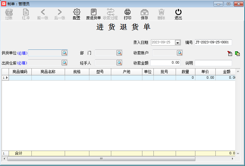 过账:进货退货单如果保存了,但是没有过账的话,不会对相应的商品进行出库操作,供应商的往来账也是不会变化的。进货退货单在未过账的情况下制单人可以修改单据中的数量,有价格查看权限的操作员可以修改价格和删除单据。但是过账过后,会对相应的商品进行出库操作,单据中的金额也会记入供应商的往来账中。单据也不可再修改。