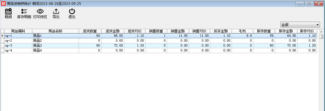 操作:【查询统计】-【进销存统计】-【所有商品/部分商品】。