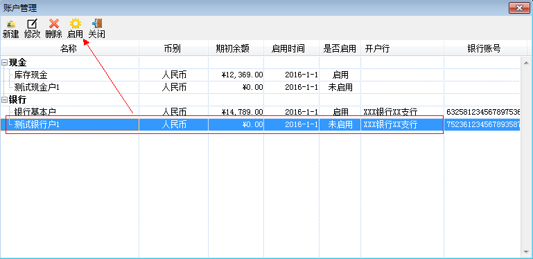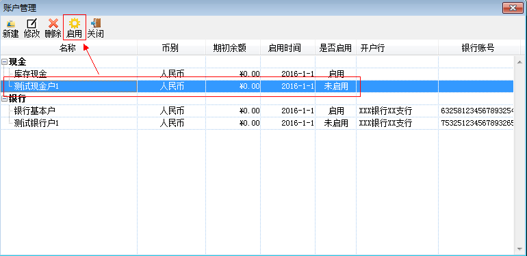 现金账户启用:对尚未启用的现金账户进行启用。点击工具栏【启用】,如图