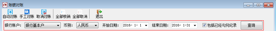 查询:指定账户、起止日期及其[包括已经勾兑记录]设置项,点击工具栏【查询】,反馈显示符合查询条件的结果。如图